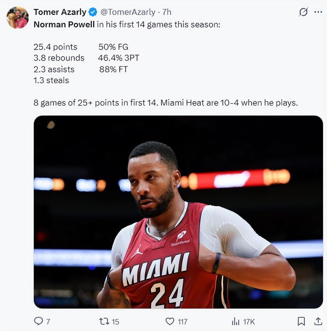 而且本赛季鲍威尔场均30.5分钟,拿到25.4分3.8篮板2.3助攻1.3抢断,命中率50%,三分命中率46.4%,正负值+6.2,他帮助热火拿到10胜4负的战绩,已经8场25+。快船记者晒出他这个数据暗示对休赛期用他换科林斯不满。